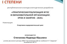 Дипломом I степени республиканского конкурса методических разработок "Практическая реализация ФГОС в образовательной организации: урок и занятие - 2025" в номинации "Спортивно-оздоровительный цикл" награждена Степанова Надежда Юрьевна, учитель физической культуры нашей школы. Конкурс организован Министерством образования и науки РТ, ГАОУ ДПО "Институт развития образования РТ". Поздравляем Надежду Юрьевну с победой в престижном республиканском конкурсе. Желаем новых побед!