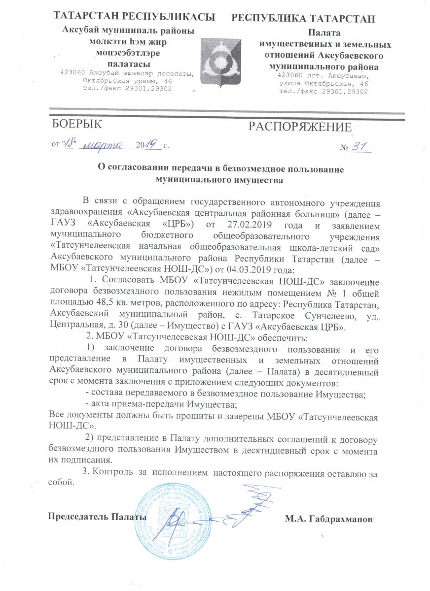 Распоряжение о согласовании передачи в безвозмездное пользование муниципального имущества