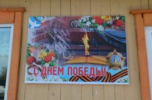 Мәктәпкә килеп керүгә "Бөек җиңүнең 70 еллыгына" әзерләнгән баннер эленеп тора.