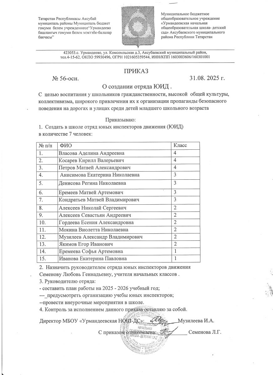 Приказ о создании отряда ЮИД и назначении руководителя отряда
