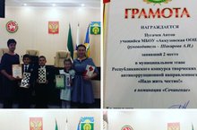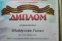 Әлмәт шәһәрендә үткәрелгән "Они должны идти победным строем в любые времена" дип аталган рәсем конкурсында Шайдуллин Гамил дипломга һәм истәлекле бүләккә ия булды. Җитәкчесе: Шайдуллина Л.Н.