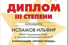 В республиканском конкурсе «Я рисую победу» ученик 4 класса Исламов Ильфир занял 3 место в номинации «Оружие Победы». Руководитель: Шайдуллина Л.Н.///