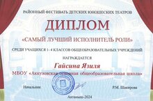 В районном фестивале детских юношеских театров ученица 4 класса Гайсина Язиля награждена дипломом «Самый лучший исполнитель роли» среди учащихся 1-4 классов общеобразовательных учреждений. Руководитель Хисамова А.Ф.///