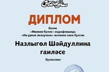 Ученица 6 класса МБОУ «Аккузовская ООШ» Назлыгуль Шайдуллина стала победителем в номинации «Иң үрнәк яклаучым» в марафоне журнала «Сабантуй» «МИННӘН БҮЛӘК», посвященном Дню защитника Отечества. Назлыгуль был вручен Диплом и памятный подарок от журнала «Сабантуй». Руководитель Шайдуллина Лейля Наилевна.