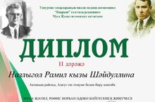 В литературном конкурсе имени Мусы Джалиля, Рафиса Курбана, проводимом национально-культурной автономией татар Удмуртии и библиотекой им.М. Джалиля города Ижевска, ученица 5 класса МБОУ “Аккузовская ООШ” Шайдуллина Назлыгуль была награждена Дипломом II степени. Руководители: Хисамова Айсылу Фаритовна и Зямилова Розалия Гарифяновна. Поздравляем!