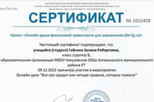 Безнең мәктәпнең 8 нче сыйныф укучылары «Барысы да кредит турында яки максатка ирешергә ярдәм итүче дүрт кагыйдә турындафинанс грамоталылыгы дәресендә катнаштылар. Дәрес балаларга яхшы тәэсир калдырды. Онлайн дәреснең үзенчәлеге булып мәктәп укучыларының финанс базары өлкәсендәге профессионаллар белән аралашу тора. Шул ук вакытта балалар материалны тыңлап кына калмады, дәрестә дә актив катнаштылар. Укучыларга кредитлар тарихы аеруча кызыклы булды. Укучылар кредит килешүләренең нечкәлекләрен белделәр, килешү төзегәндә нәрсәгә игътибар итәргә кирәклеген белделәр. Дәрес җитәрлек аңлаешлы һәм дөрес аңлатылды.