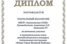 26 октября 2022 года был проведен муниципальный этап республиканского конкурса театральных постановок «Юные герои Великой Победы». Театральный коллектив МБОУ «Аккузовская ООШ» награждена дипломом Актанышского местного отделение Татарстанкого регионального отделения Партии «Единая Россия» за активное участие. Руководители: Ахметова З.Н., Зямилова Р.Г.///