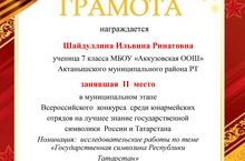 Ученица 7 класса Шайдуллина Ильвина заняла II место в муниципальном этапе Всероссийского конкурса среди юнармейских отрядов на лучшее знание государственной символики России и Татарстана в 2021 году. Номинация: исследовательские работы по теме «Государственная символика Республики Татарстан». Руководитель: Зямилова Розалия Гарифяновна. Поздравляем!