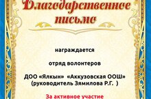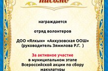 С 5 по 20 декабря 2021 года был проведен муниципальный этап Всероссийской акции по сбору макулатуры на базе ДОО образовательных организаций. В соответствии с протоколами жюри отряд волонтеров ДОО «Ялкын» МБОУ «Аккузовская ООШ» награжден Благодарственным письмом МКУ «Управление образования» Исполнительного комитета Актанышского муниципального района РТ за активное участие в муниципальном этапе Всероссийской акции по сбору макулатуры Педагог – организатор: Зямилова Р.Г.///