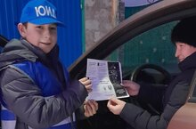 ЮИД отряды члены И.Вәлиев машина йөртүчегә буклет таратты./Член отряда ЮИД И.Валиев раздал водителю буклеты.