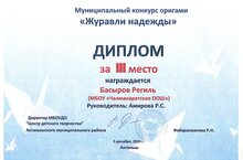 7 нче класс укучысы – Р,Ф.Басыйров “Өмет торналары” оригамикул эшләре бәйгесендә 3 нче урын алды. Ул Дипломга һәм истәлекле бүләккә лаек булды. Укытучысы - Әмирова Р.С.. Котлыйбыз!Ученик 7 класса Басыров Региль награжден Дипломом 3 место в районном конкурсе оригами: «Журавли надежды». Он был удостоен и памятной награды. Руководитель Амирова Р.С.. Поздравляем!