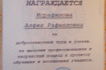 Авыл җирлегенең еллык эшкә йомгак ясау җыелышында мәктәбебезнең татар теле һәм әдәбияты укытучысы Ә.Р.Исрафилова, хезмәттә ирешкән уңышлары өчен, Мактау грамотасы белән бүләкләнде. Фән олимпиадалары һәм район, республика конкурсларында укучыларының һәм үзенең алган призлы урыннарын бәяләгән өчен, җирлек башлыгы К.С.Әхметовка рәхмәтебезне белдерәбез.