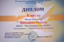 6 нчы класс укучысы – Р,Ф.Басыйров “Өмет торналары” оригамикул эшләре бәйгесендә 2 нче урын алды. Ул Дипломга һәм истәлекле бүләккә лаек булды. Укытучысы - Әмирова Р.С.. Котлыйбыз! Ученик 6 класса Басыров Региль награжден Дипломом 2 место в районном конкурсе оригами: «Журавли надежды». Он был удостоен и памятной награды. Руководитель Амирова Р.С.. Поздравляем!