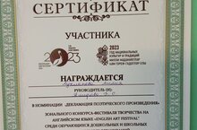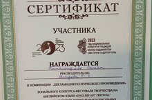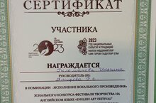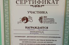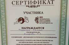 Ученик 2 класса Л.Н.Лукманова награждается сертификатом участника в номинации “Исполнение вокального произведения” зонального конкурса фестиваля творчества на английском языке среди обучающихся дошкольных и школьных образовательных организаций. Руководитель: Р.С.Амирова. Поздравляем!