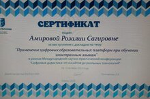Р.С.Амирова награждена сертификатом за выступление с докладом на тему: «Применение цифровых образовательных платформ при обучении иностранным языкам» в рамках Международной научно-практической конференции «Цифровая дидактика от инсайтов до реальных технологий»