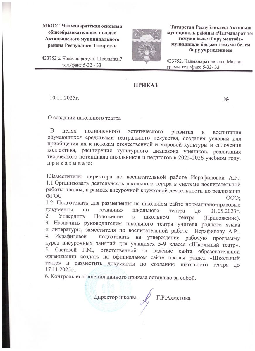 Муниципальное бюджетное общеобразовательное учреждение "Чалманаратская основная общеобразовательная школа" Актанышского муниципального района Республики Татарстан/Татарстан Республикасы Актаныш муниципаль районы "Чалманарат төп гомуми белем бирү мәктәбе" гомуми белем бирү муниципаль бюджет учреждениесе