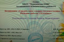 Салахова Таңсылу "Әни-бәхет" дип аталган Республикакүләм иҗади конкурста 1 урынга лаек булды, диплом белән бүләкләнде.