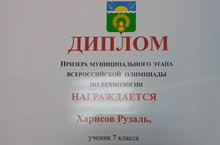 Технологиядан Бөтенроссия фән олимпиадасының муниципаль этабында 7 класс укучысы Харисов Рүзәл призёр булды.