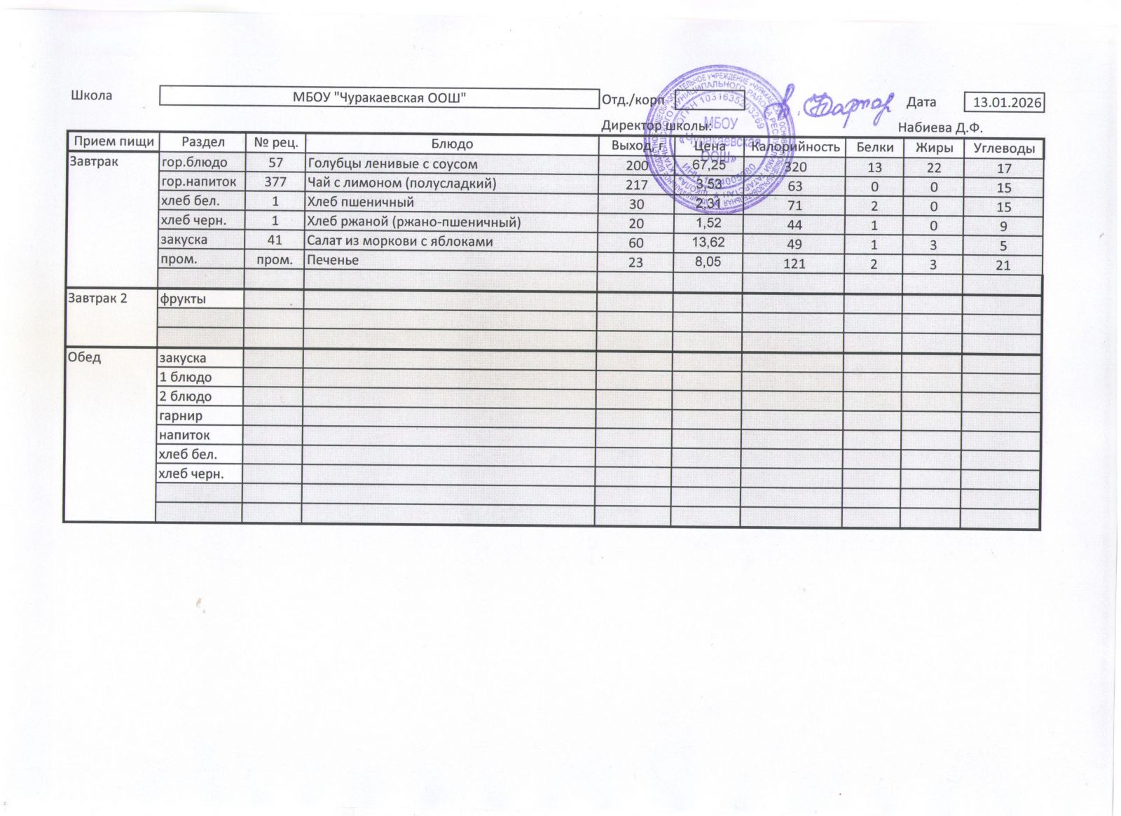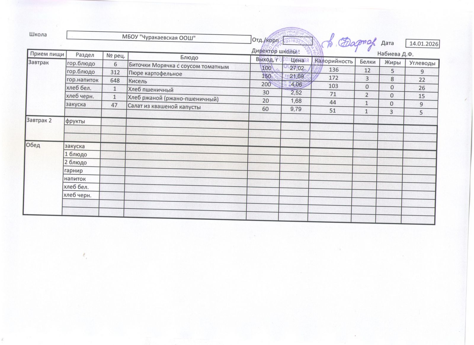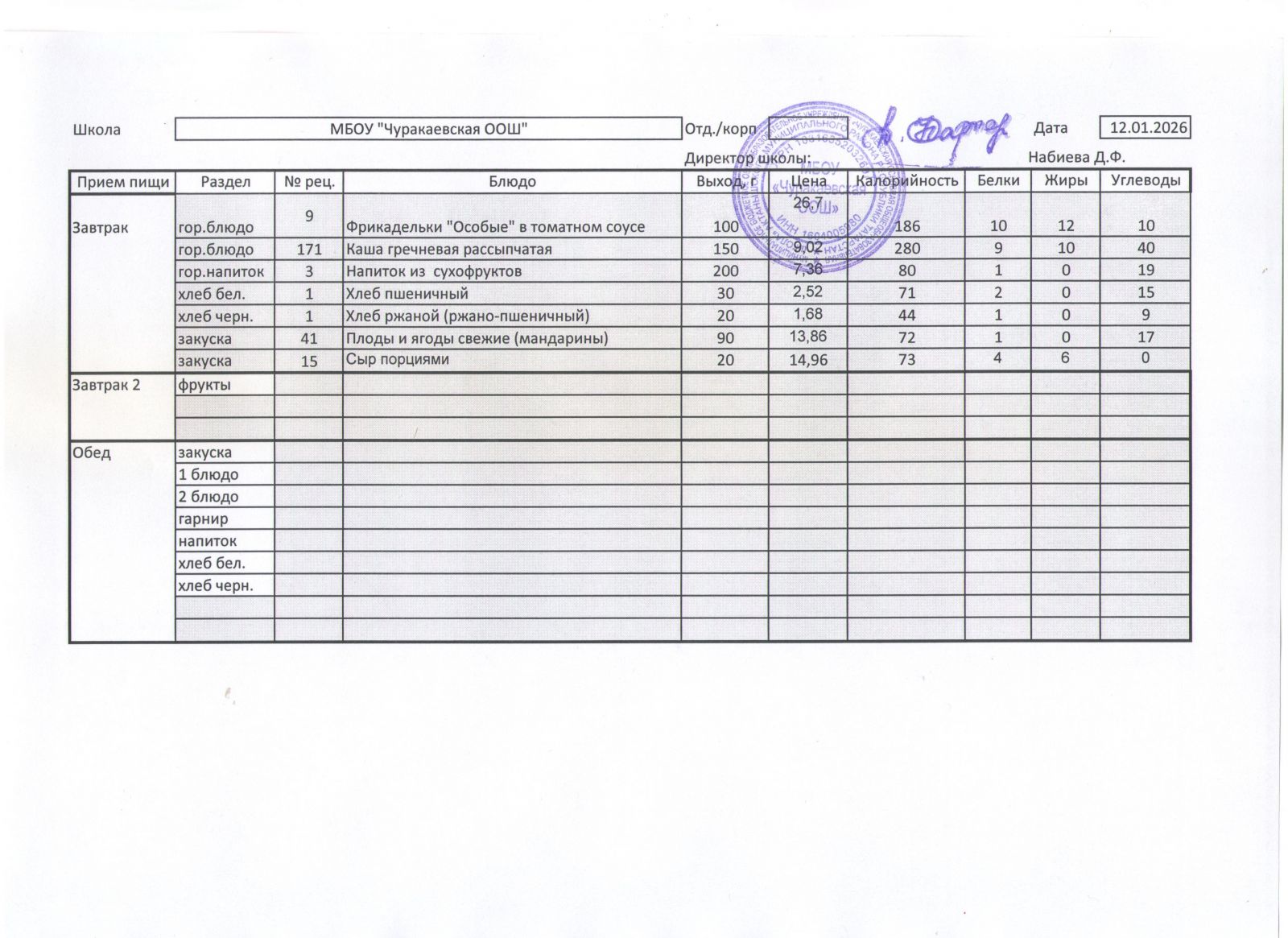 Однодневное меню