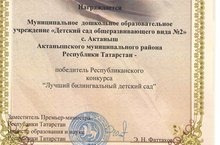 Татарстан Республикасы балалар бакчаларында дәүләт телләрен өйрәтү максатыннан үткәрелүче "Иң яхшы билингваль балалар бакчасы" республикакүләм бәйгедә безнең бакча җиңү яулап 1 миллион сумлык грантка ия булды.