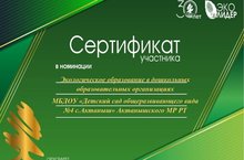 Министерство экологии и природных ресурсов Республики Татарстан с 2004 года проводит конкурс "Эколидер". Его цель-повышение внимания к вопросам экологии и окружающей среды. В конкурсе ежегодно принимают участие различные организации, предприятия, частные лица и общественные объединения. В программе 2022 года зарегистрировано 326 заявок. Больше всего в номинации" Экологическое образование в дошкольных образовательных учреждениях": всего участвовало 66 детских садов. В том числе команда" Актанышский общеобразовательный детский сад № 4 " попробовала себя в этом конкурсе. В результате успешного выступления команде был вручен сертификат участника.