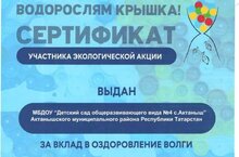 Безнең 4 нче балалар бакчасы, 2023 елның октябрь ахырында, “Водорослям крышка!” экологик акциядә катнашты. Нинди акция соң бу? Һәр төркем, һәр бала, һәр ата-ана, ел буе пластик капкачлар җыйды. Җыелган капкачларны без Саратов өлкәсендәге пластик капкачлар җыю пунктына тапшырдык. Бу капкачлар эшкәртелүгә җибәрелә. Эшкәртелгән пластмаслар өчен бирелгән акчага кечкенә балыкчыклар сатып алына һәм Волга елгасына җибәрелә. Балык үз чиратында су үсемлекләрен ашый. Су чистара. Бөек Волгага безнең дә өлешебез булуга без бик шат!
