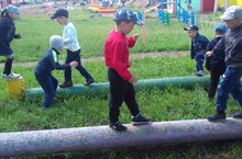 Кече яшьтәге балаларының сәламәтлеген ныгыту бүгенге көндә иң мөһим факторларның берсе. Шуна курә бакчабызда җәйге чорда да бу юнәлештә эш даими алып барыла. Атнаның ике көне физкультура шөгыльләренә багышлана. Уртанчылар төркеме балалары - спорт мәйданчыгында.