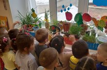 2 кечкенәләр төркеменең тәрәзә төбендә кечкенә бакча бар. Анда балалар белән бергәләп чәчәкләр утырттык, ата- аналар ярдәме белән суган, борыч, помидорлар, кыярлар, башка бик күп төрле үсемлекләр үсә. Балалар үсемлекләрнең үсүен көндә күзәтеп торалар, сулар сибәләр. Тәрбияче: Шәйхетдинова Ч.Т.