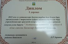 Балалар бакчабыз, 2022 нче ел нәтиҗәләре буенча тәрбия һәм белем бирү эшчәнлегендә 3 төркемнән күбрәк мәктәпкәчә белем бирү учреждениеләре арасында югары күрсәткечләргә ирешеп, беренче урын яулады, һәм алдынгылар слетында диплом белән бүләкләнде.