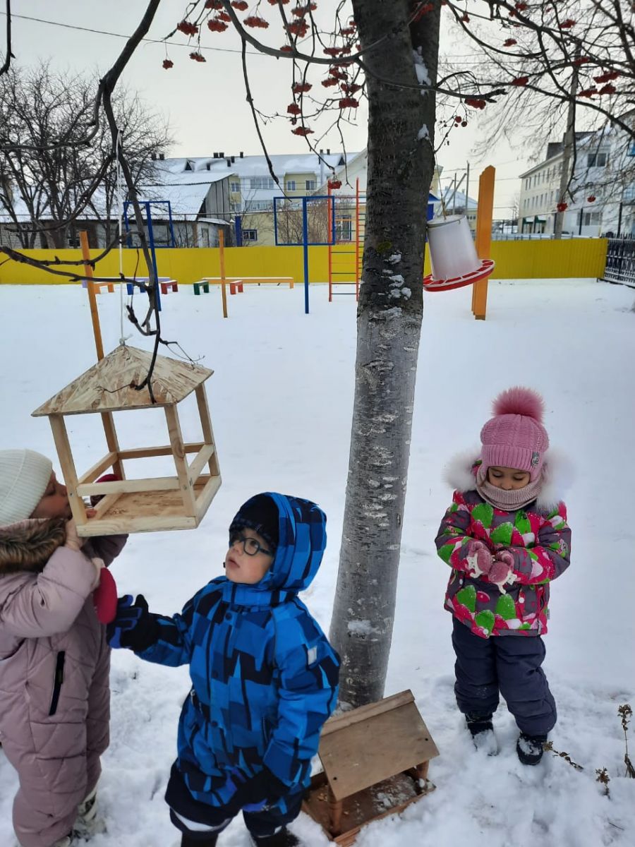 Круглый год наши дети наблюдают за птицами. Пополняют свои знания о зимующих птицах и о птицах, которые улетают в теплые края. Зимой организуем акции «Кормушки птицам». И в этом году дети средней группы вместе с родителями сделали кормушки. На деревьях, растущих на участке нашего детского сада, развесили кормушки и организовали столовую для птиц. Птиц постоянно подкармливают. Выйдя на свежий воздух, дети любят наблюдать за тем, как кушают синицы и воробьи. Воспитатель: Насрыева Л.Н.