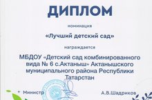 Муниципальное бюджетное дошкольное образовательное учреждение «Детский сад комбинированного вида №6 села Актаныш» Актанышского муниципального района Республики Татарстан/Татарстан Республикасы Актаныш муниципаль районы бюджет мәктәпкәчә белем бирү учреждениесе "Актаныш катнаш төрдәге 6 нчы балалар бакчасы"
