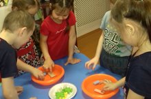 Уртанчылар төркеме балалары белән рус халык бизәге - дымков белән таныштык. Балаларга иң элек элеге бизәкнең үзенчәлекләре, кайларда кулланылуы турында мәгьлүмат бирелде. Аннары әлеге бизәкне кулланып ат бизәлде. Балаларга бик ошады.