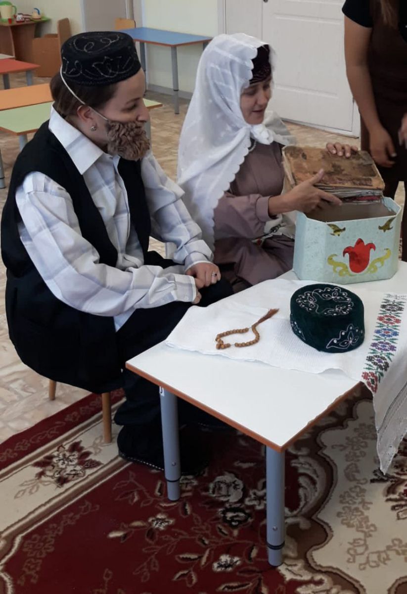 Сегодня в 1-ю младшую группу, в честь дня пожилых людей, в гости пришли бабушка и дедушка. Они с собой принесли сундук, который является достоянием нашей нации. Познакомили детей с наследием татарского народа. Дети с интересом наблюдали. В знак благодарности подарили им свой танец.