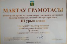 26 апрель көнне бакчабызның мәктәпкә хәзерлек төркеме балалары "Без - "Туган тел"дән туганнар, без-Тукай оныклары!"исемле халкыбызның бөек шагыйре Г.Тукайга багышланган шигырь бәйрәмендә катнашып "Актаныш авыл җирлегеара үзәк китапханәсенең" Рәхмәт хаты белән бүләкләнделәр.