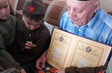 Балалар кызыксынып, ветеранның орден медальләрен тотып та, тагып та карадылар.
