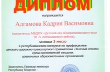 5 март көнне Мамадыш шәһәренедә "Яшел ут-2018" республика бәйгесенең финалы узды.Бәйгедә муниципаль һәм республика турының беренче этабында җиңү яулаган тәрбиячеләр катнашты. Лаеш, Саба, Тәтеш, Кукмара,Менделеевск, Казан, Бөгелмә, Әлмәт шәһәре тәрбиячеләре белән бер рәттән безнең тәрбиячебез Адгамова Кадрия Васим кызыда көч сынашты.