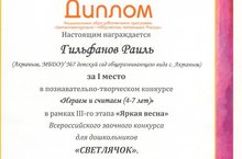 Воспитанник старшей группы Гильфанов Раиль стал победителем (1 место) в познавательно-творческом конкурсе" Играем и считаем"(4-7 лет) в рамках III-го этапа "Яркая весна" Всероссийского заочного конкурса для дошкольников "Светлячок"