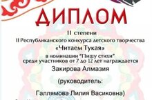 "Тукайны укыйбыз" балалар иҗаты II республикакүләм конкурсында катнашып, Алмазия Закирова "Шигырь язам" номинациясендә II дәрәҗә дипломга лаек булды. Җитәкчесе - Лилия Васик кызы Галләмова). Алмазия, котлыйбыз сине! Киләчәктә дә иҗат уңышлары телибез!