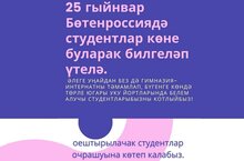 25 гыйнвар Бөтенроссия студентлар көнө буларак билгеләнеп үтә. Әлеге уңайдан без дә гимназия-интернатны тәмамлап, бүгенге көндә төрле югары уку йортларында белем алучы студентларыбызны котлыйбыз. 27 гыйнвар көнне оештырылачак студентлар очрашуына көтеп калабыз. Вакыты: 15.00, урыны: гуманитар гимназия-интернатның актлар залы.