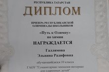 Гимназиянең 10 класс укучысы Галлямова Элвина республикакүләм үткәрелгән "Олимпка юл" олимпиадасының химия фәненнән призер исеменә лаек булды. Элвинаны һәм остазы Гарипова Рузилә Илдар кызын җиңүләре белән котлыйбыз!