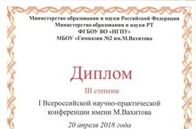 Гимназиянең 11 класс укучылары Галиева Ралина һәм Госманова Алия, Яр Чаллы шәһәренең 2нче санлы гимназиясе базасында үткәрелгән М. Вахитов исемендәге I Бөтенрәсәй фәнни-практик конференциясендә уңышлы чыгыш ясап, III урынны яуладылар. Укучылар әлеге конференциядә “Кызыклы тәнәфес” дип исемләнгән интерактив проектны якладылар. Кызларны һәм җитәкчеләре Шәвәлиев Ленар Зөфәк улын, Хөсәинов Ленар Наил улын җиңүләре белән котлыйбыз!