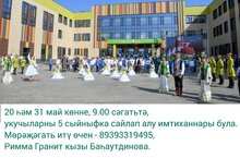 20 һәм 31 май көнне, 9.00 сәгатьтә укучыларны 5 сыйныфка сайлап алу имтиханнары була. Мөрәҗәгать итү өчен - 89393319495, Римма Гранит кызы Баһаутдинова.