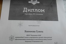 Ученица 3 класса Хакимова Гузель в мероприятии videourok.net "Дистанционная олимпиада по английскому" заняла 3 место и награждена Дипломом.