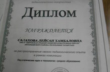 Учительница начальных классов Салахова Лейсан Хамбаловна награждена дипломом Всероссийского фестиваля педагогического творчества за распространение своего педагогического опыта в рамках номинации " Педагогические идеи и технологии: среднее образование".