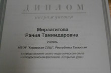 Мирзагитова Рания Тамимдаровна- учительница русского языка и литературы, Загитова Ильсия Индусовна- учительница музыки, награждены дипломами лауреата конкурса Всероссийский фестиваль педагогических идей "Открытый урок".