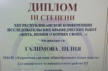 Туган якны өйрәнү буенча эзләнү эшләренә карата "Үз буыныңның тамырларын бел" темасында уздырылган 13 нче Республика конференциясе бәйгесендә Галимова Лилия (8кл) 3нче урынга, Бутаков Максим (10кл),Хафизова Зилә (7кл) сертификатка ия булдылар.Укытучылары - Гаянова Й.З., Мирзагитова Р.Т., Хафизова Р.Ф.