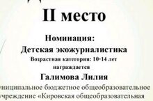 Киров урта мәктәбенең 7 класс укучысы Галимова Лилия " Праздник эколят - молодых защитников природы" Россиякүләм фестивалендә катнашты. Ул "Балалар экожурналистика " юнәлешендә видеоязма төшереп, мактаулы II урынга ия булды.