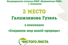 Ученица 8 класса нашей школы Газимзянова Гузель заняла 2 место на конкурсе "С чистого листа" в номинации "Сохраним мир дикой природы". Примите наши огромные поздравления! Удачи на остальных конкурсах!!!