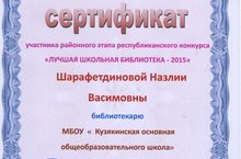 "Иң яхшы китапханә" республика конкурсының район этабында катнашкан өчен китапханәче Шарафетдинова Н.В. сертификат алды.