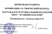 Чит телдә җыр район конкурсының "Иҗади якын килү" номинациясендә мактаулы грамота белән Күҗәкә мәктәбе музыкаль коллективы бүләкләнә. Җитәкчесе Ахмадуллина Р.З.